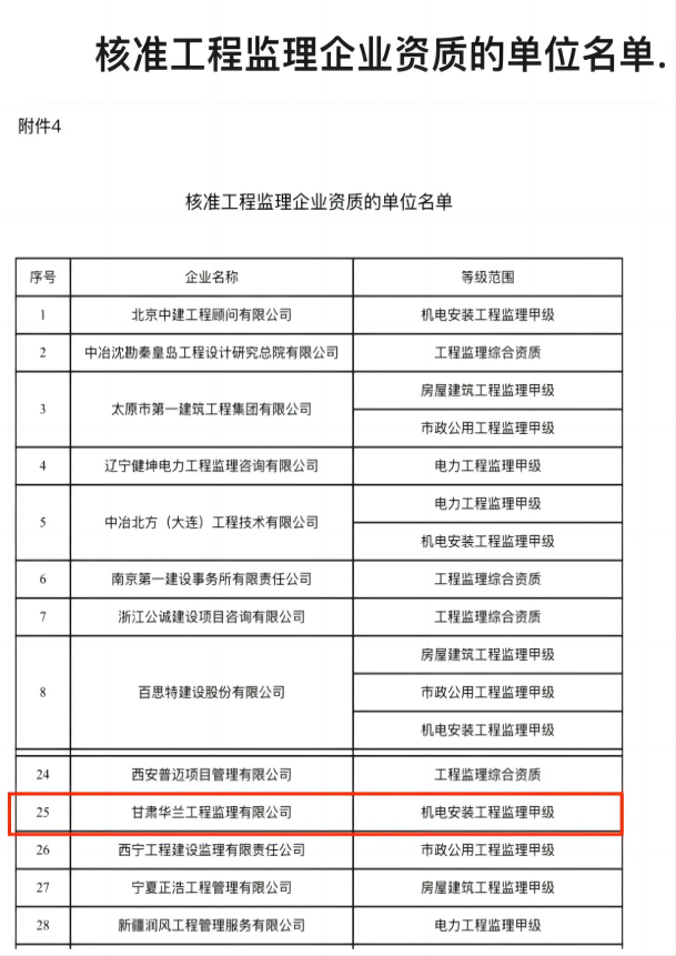 2023年新年伊始,甘肅建科院全資子公司華蘭工程監(jiān)理有限公司近日成功取得住房和城鄉(xiāng)建設(shè)部頒發(fā)的機(jī)電安裝工程監(jiān)理甲級資質(zhì)。