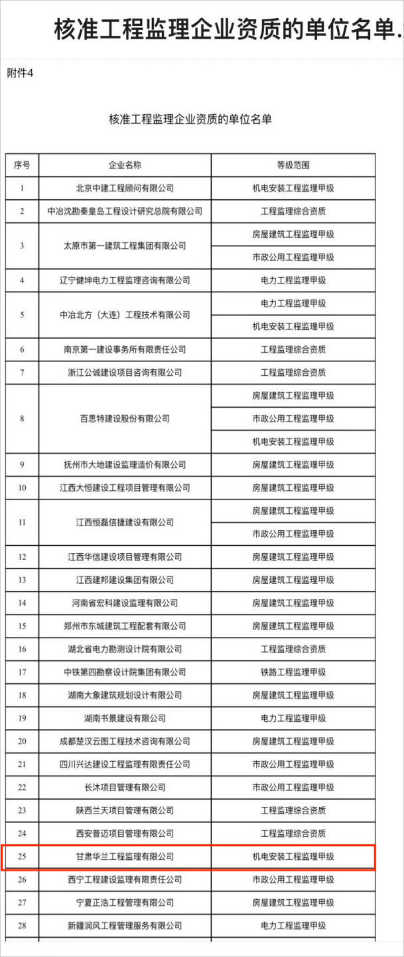 2023年新年伊始,甘肅建科院全資子公司華蘭工程監(jiān)理有限公司近日成功取得住房和城鄉(xiāng)建設(shè)部頒發(fā)的機(jī)電安裝工程監(jiān)理甲級資質(zhì)。