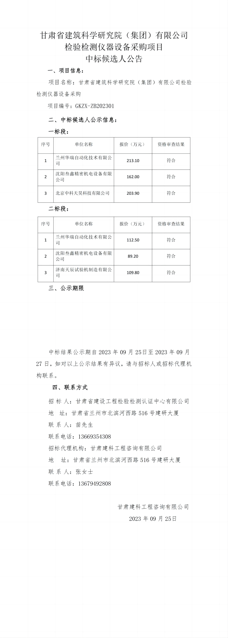 甘肅省建筑科學(xué)研究院(集團(tuán))有限公司檢驗(yàn)檢測(cè)儀器設(shè)備采購(gòu)項(xiàng)目中標(biāo)候選人公告