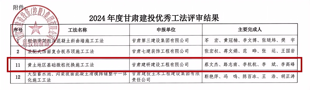 近日,由甘肅建科院建研建設(shè)公司選送的《黃土地區(qū)基礎(chǔ)微樁托換施工工法》(2024-JYJS工字001)企業(yè)級工法獲評甘肅建投2024年度優(yōu)秀工法。