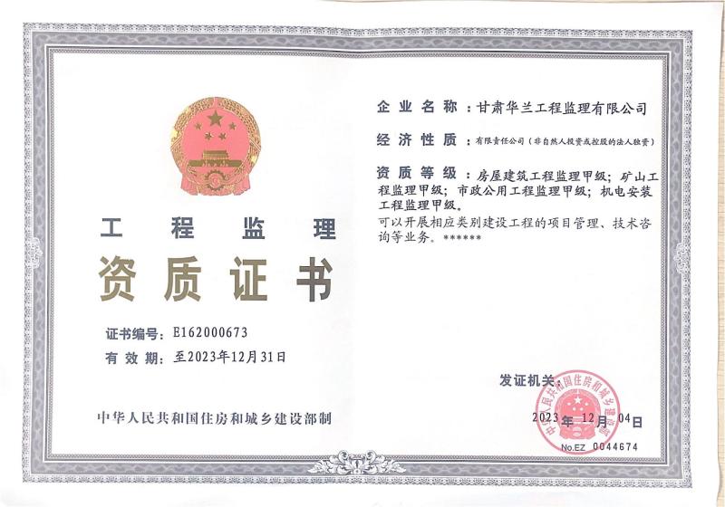2023年是華蘭監(jiān)理公司成立三十周年,在甘肅建科院的大力支持下,甘肅華蘭工程監(jiān)理有限公司近日成功取得住房和城鄉(xiāng)建設(shè)部頒發(fā)的礦山工程監(jiān)理甲級(jí)資質(zhì)。